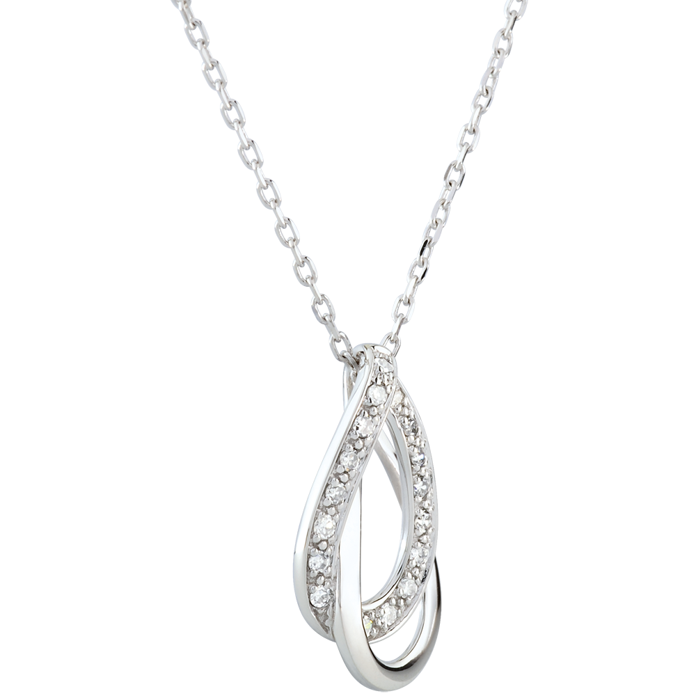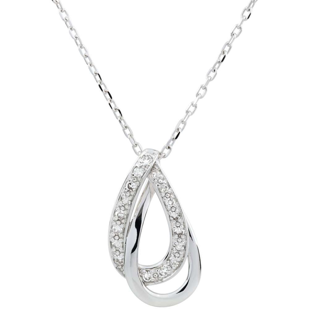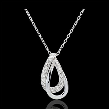 Un duo de gouttes enlacées est supendu avec charme à une chaîne en or blanc.