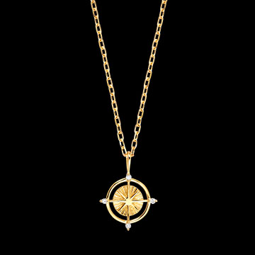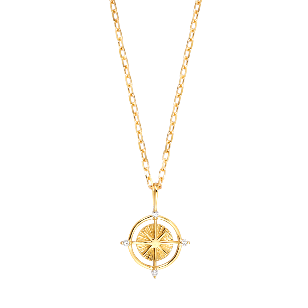 Quatre diamants scintillants marquent les points cardinaux d’un médaillon solaire au centre texturé.Un bijou symbole de direction et d’équilibre, parfait talisman pour celles qui suivent leur propre voie. Avec chaîne avec double position 42cm et 45cm en or 9 carats. Or jaune (9 carats = 375/1000): 1.5 g. Diamant synthétique : 4 - Total: 0.04 caratPlus dimensions