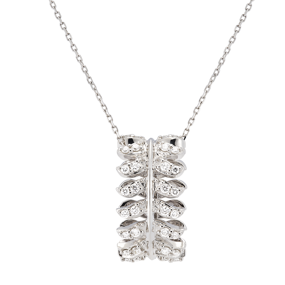 Le collier Révérence, réalisé en or blanc 18 carats, se distingue par son motif de plume circulaire finement serti de 32 diamants synthétiques d’une qualité GVS1.