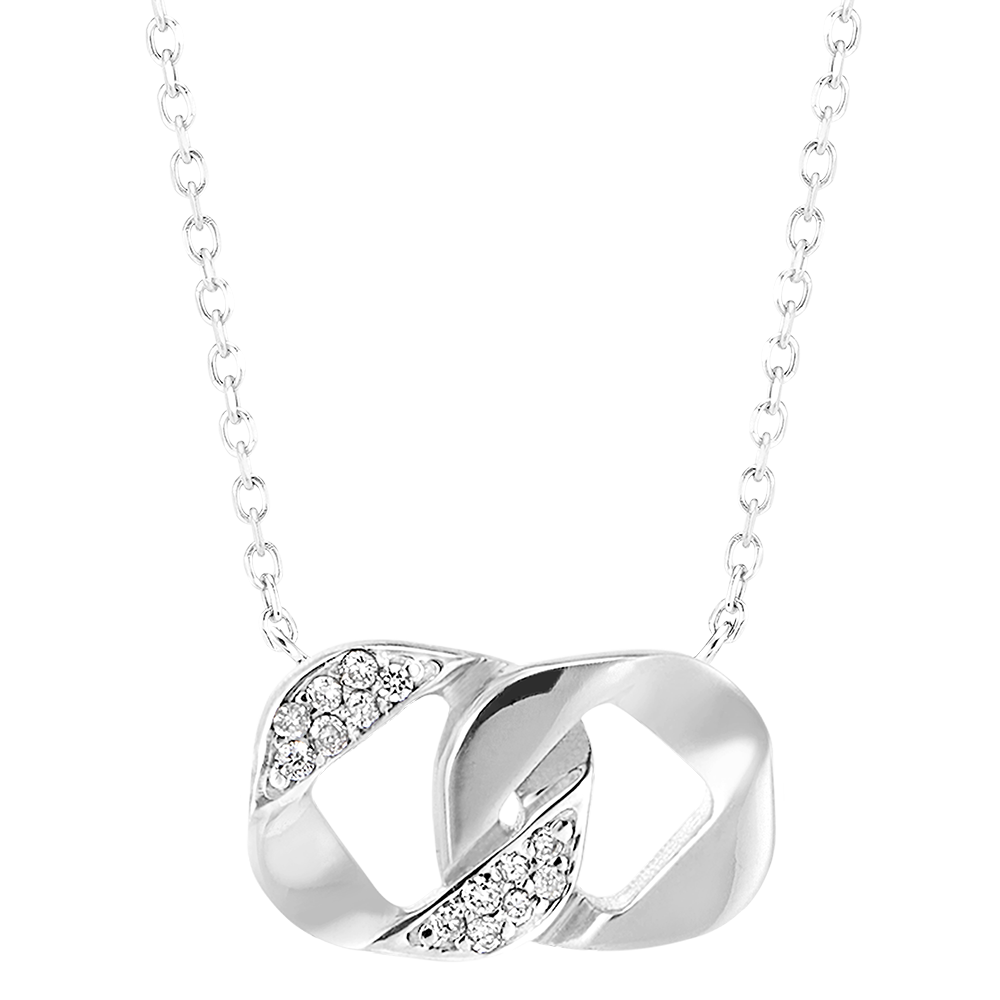 Un duo de maillons gourmette or blanc et sertis de diamants est posé une sur une chaine délicate pour un collier classique revisité. Avec chaîne de longueur 45cm et anneau de réglage à 42cm.