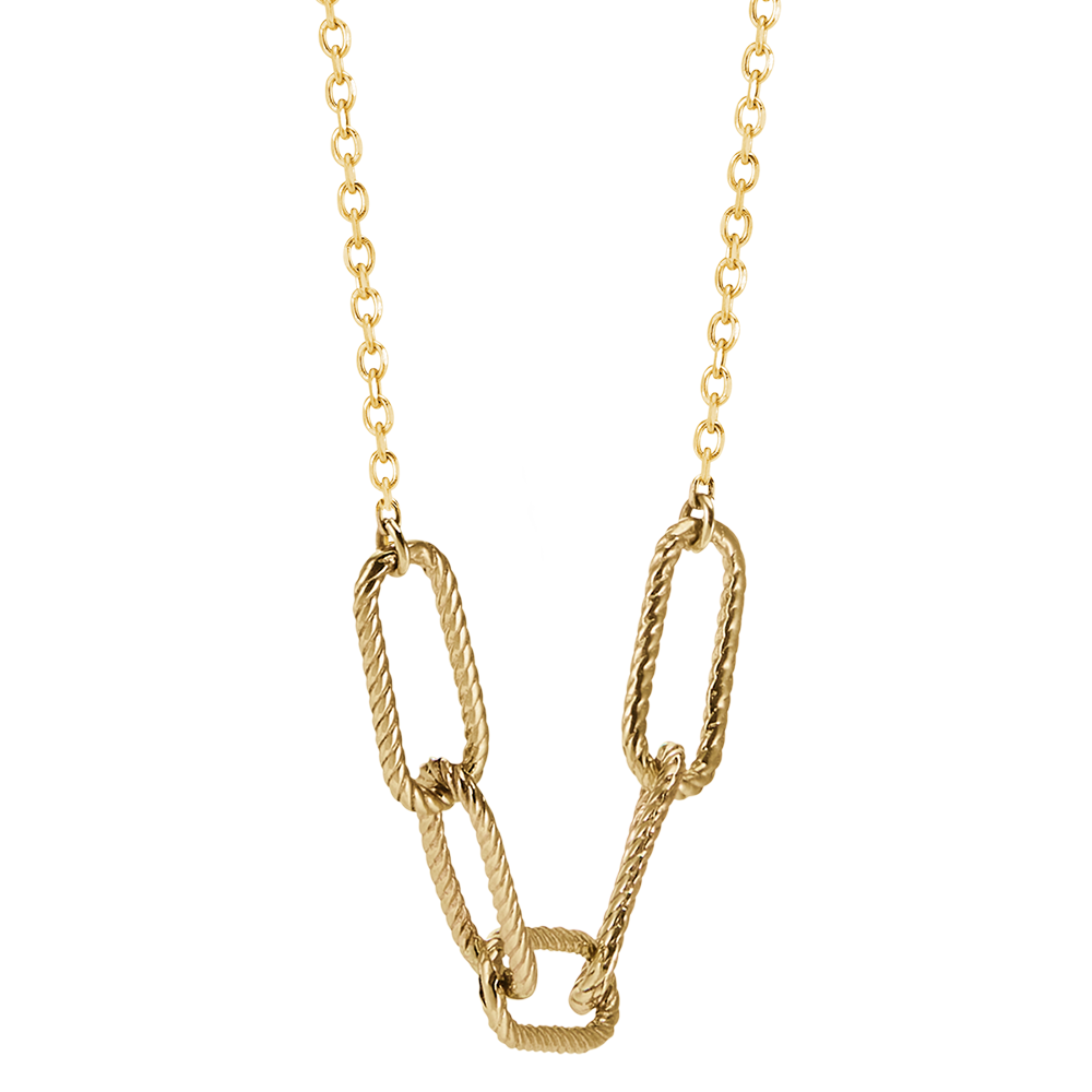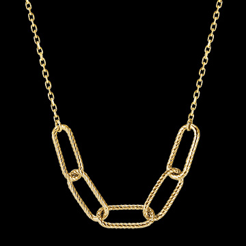 Cinq maillons or jaune finement torsadés se balancent sur une chaine délicate. Un collier moderne et féminin. Avec chaîne de longueur 45cm et anneau de réglage à 42cm. Avec chaîne avec double position 42cm et 45cm en or 18 carats. Or jaune (18 carats = 750/-): 1.7 g. Plus dimensions