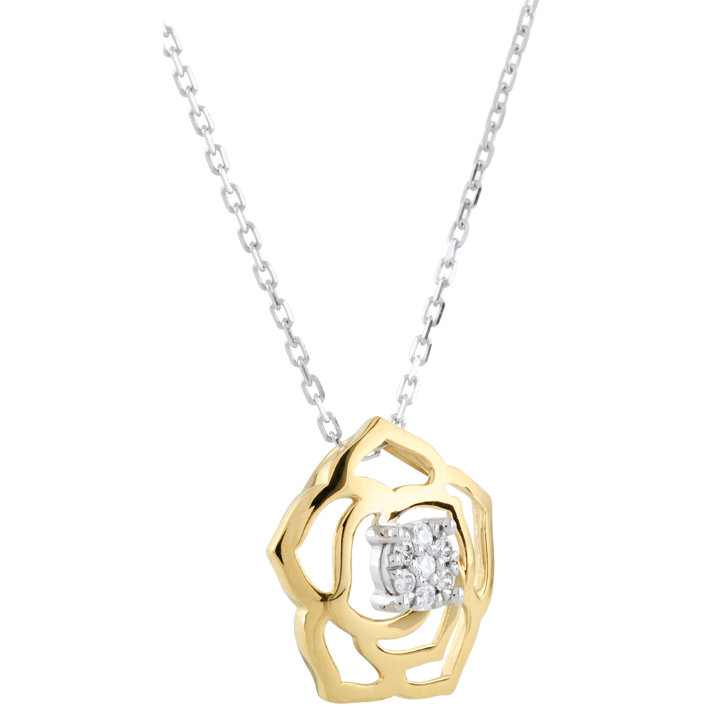 Une rose toute en contours habrite un coeur précieux de diamants. Avec chaîne avec double position 42cm et 45cm en or 9 carats. 7 diamants : 0.06 carat - Or blanc et or jaune (9 carats = 375/1000): 2.1 g. Cluster de diamants naturels : - Plus dimensions