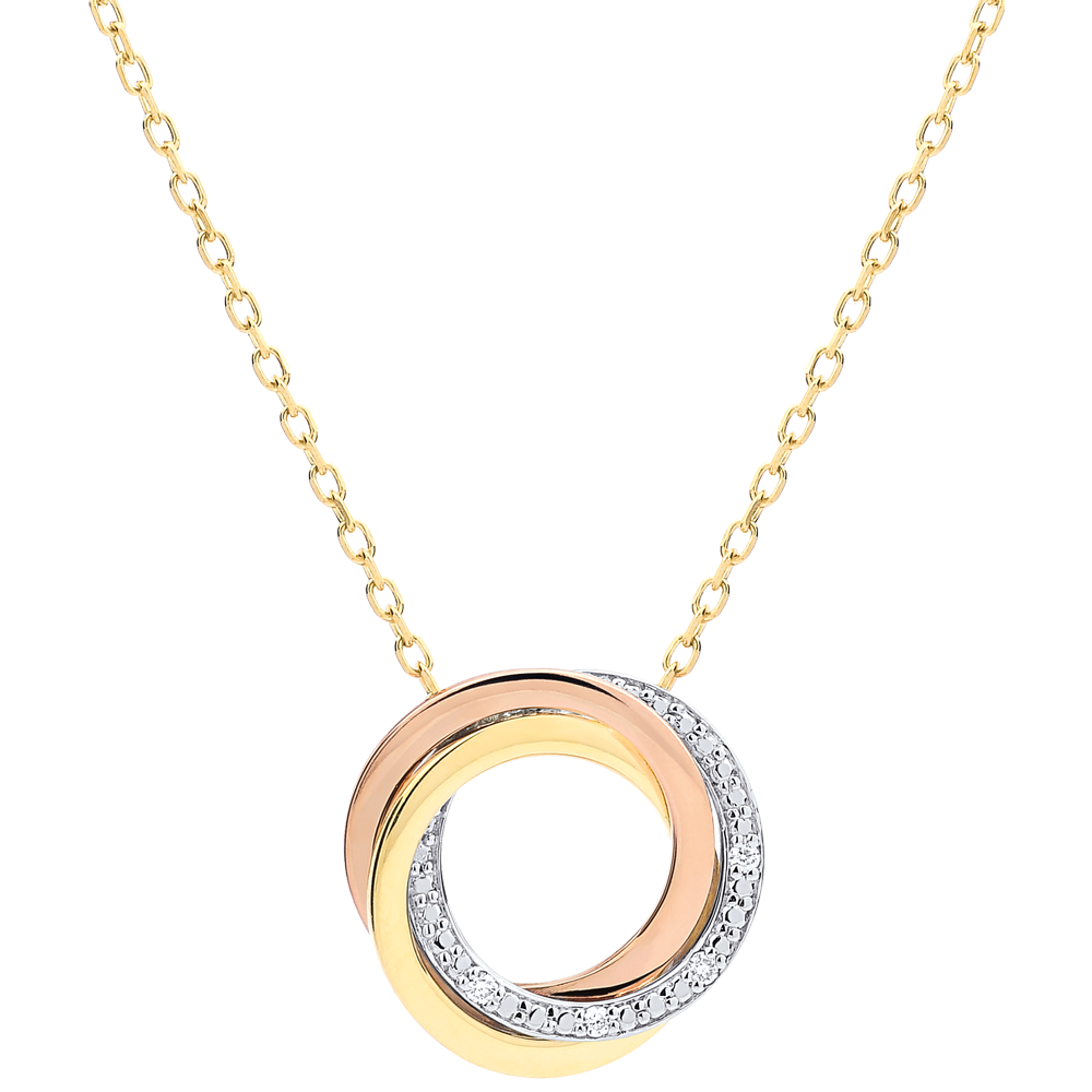 L'alliance équilibrée des trois ors soulignée d'un pavage de diamants sur or blanc est suspendue en collier intemporel. Avec chaîne avec double position 42cm et 45cm en or 9 carats. 4 diamants : 0.02 carat - Trois ors (9 carats = 375/1000): 2.9 g. Plus dimensions