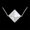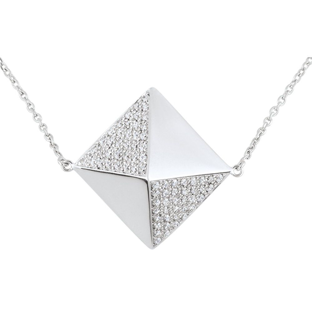 La forme d'octaèdre du diamant brut est déclinée en or et pavages de diamants pour rendre hommage à sa forme brute et originelle. Longueur: 90cm.