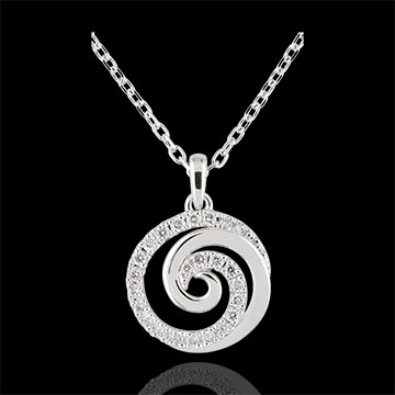 Une spirale précieuse d'or blanc et diamants est suspendue à une chaîne en or blanc.