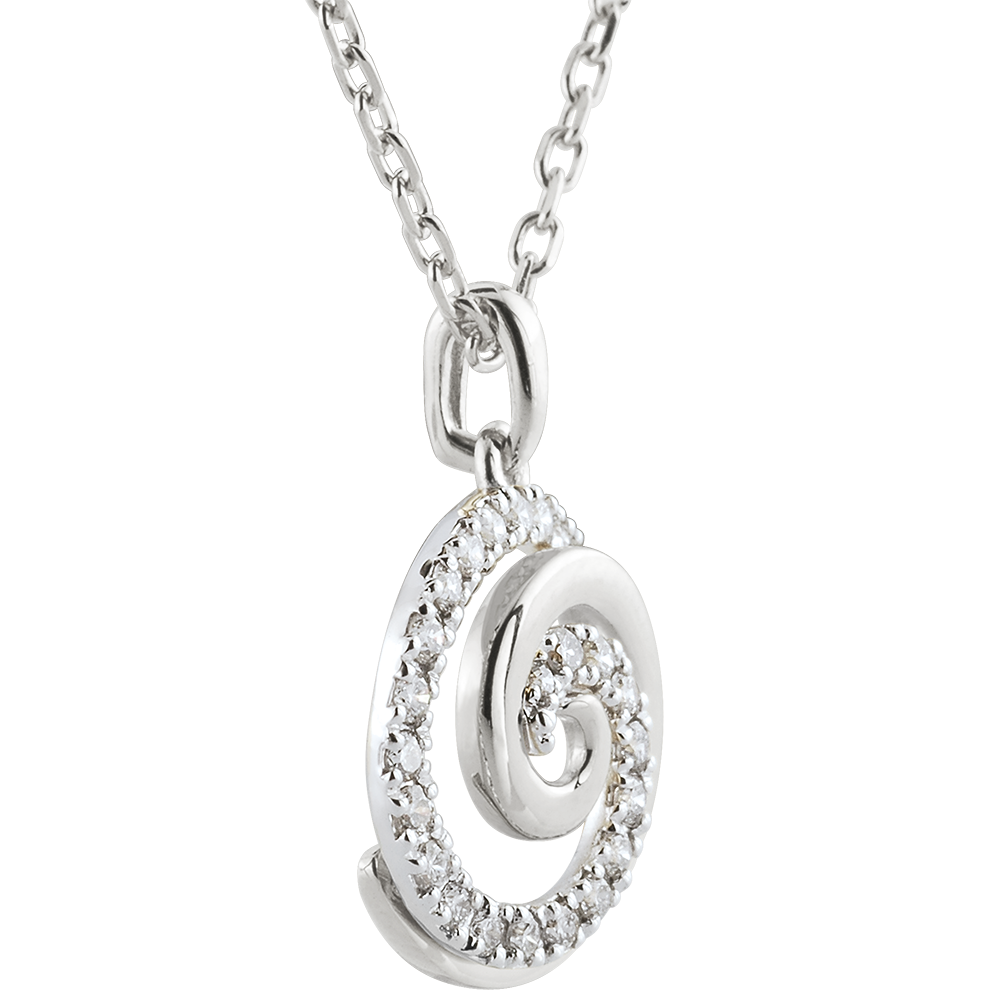 Une spirale précieuse d'or blanc et diamants est suspendue à une chaîne en or blanc.
