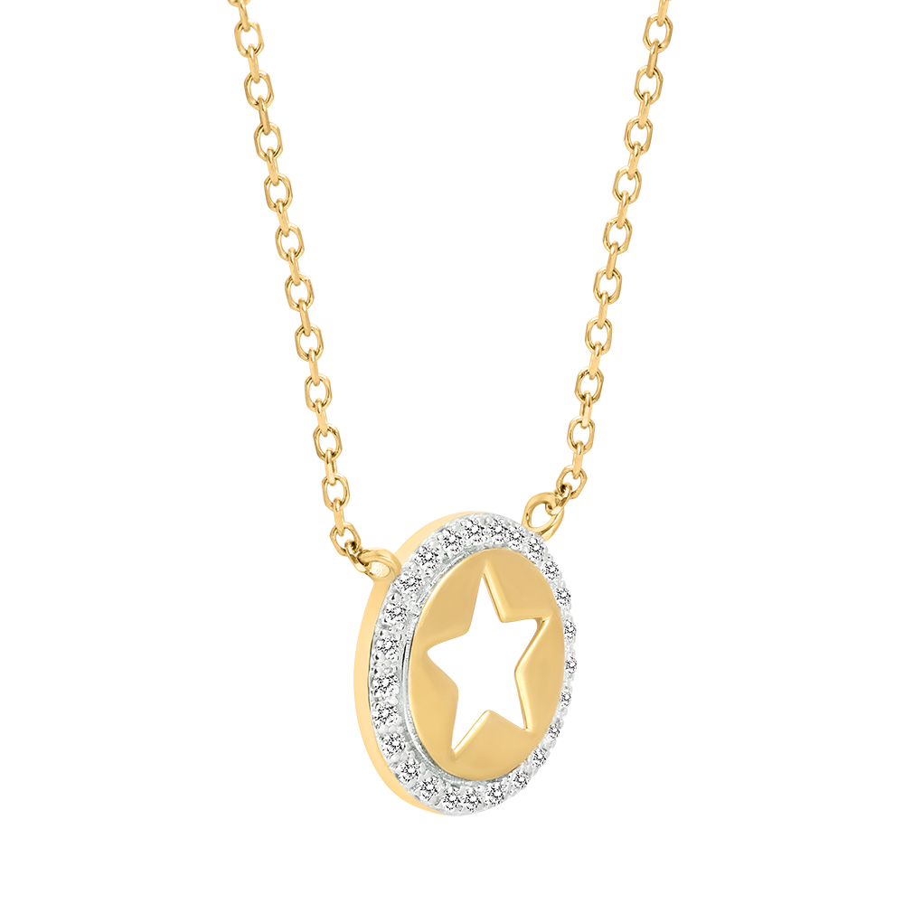 Le collier Stellar séduit par son pendentif en forme d’étoile évidée en or jaune, entourée d’un cercle pavé de 25 diamants scintillants.