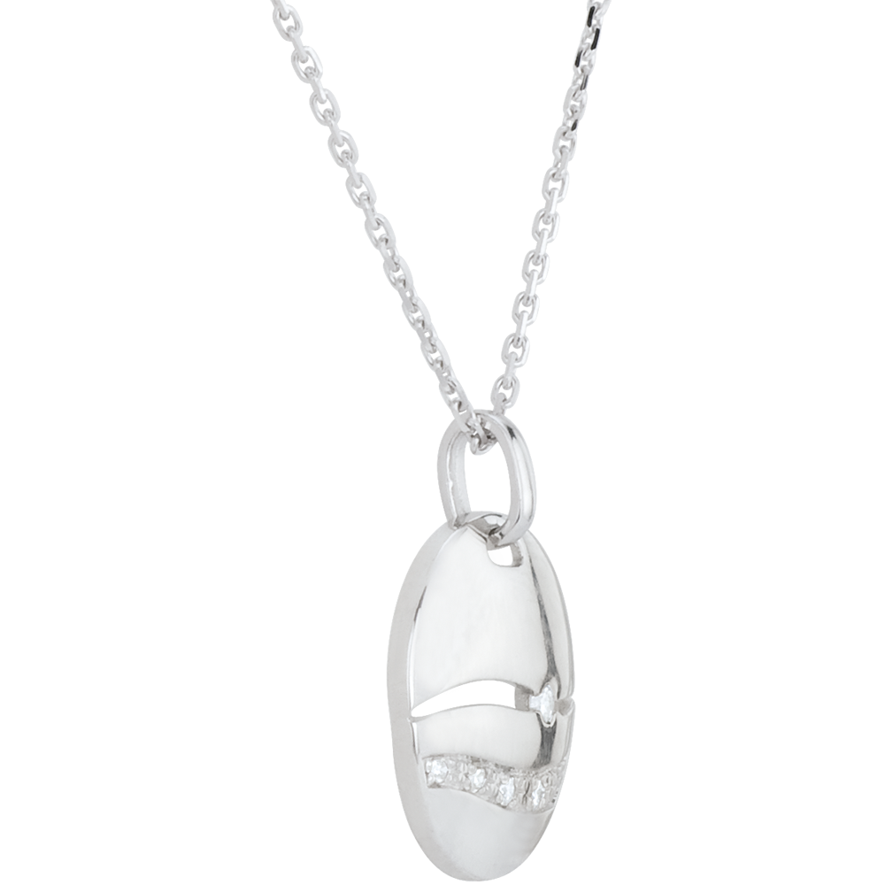 Le pendentif est serti de 5 diamants blancs totalisant 0,05 carat, dessinant un motif évoquant un coucher de soleil sur la mer.