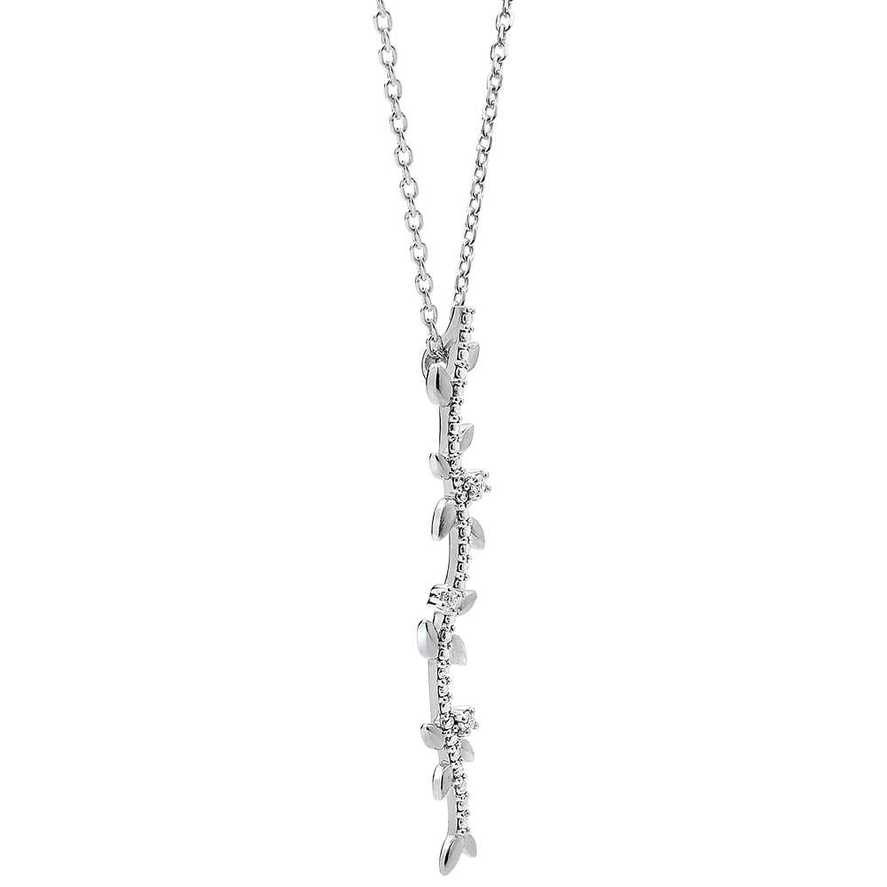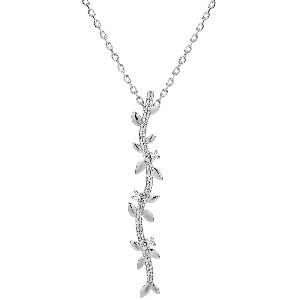 Feuilles d'or blanc brillantes et feuilles d'or brossées à la main s'assemblent pour habiller le décolleté de façon romantique. Avec chaîne avec double position 42cm et 45cm en or 18 carats. 3 diamants : 0.03 carat - Or blanc (18 carats = 750/-): 2.9 g. Plus dimensions