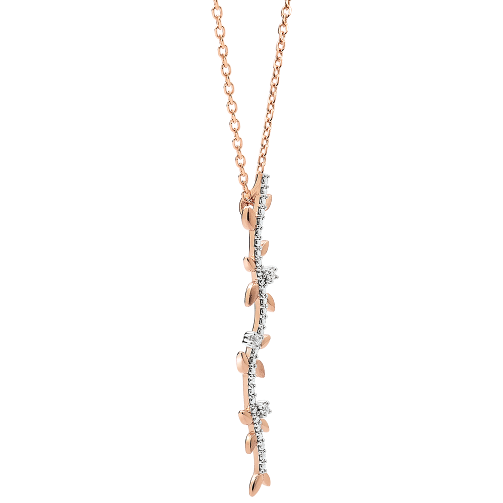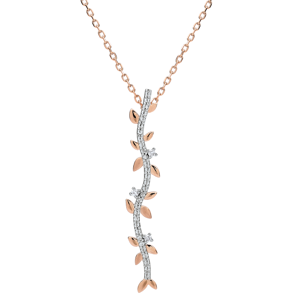 Feuilles d'or rose brillantes et feuilles d'or brossées à la main s'assemblent pour habiller le décolleté de façon romantique. Avec chaîne avec double position 42cm et 45cm en or 9 carats. 3 diamants : 0.03 carat - Or rose (9 carats = 375/1000): 1.8 g. Plus dimensions