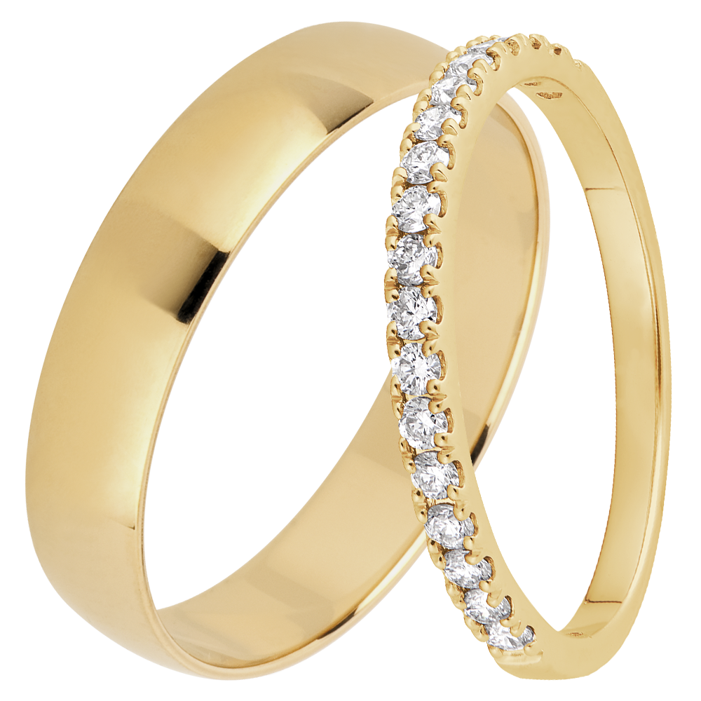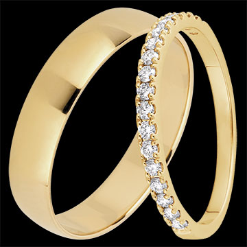 Une élégante paire d'alliances pour elle & lui. Un anneau semi pavé de 18 diamants de 0.26 carat pour madame, un anneau fin en or jaune poli de 4mm de largeur pour monsieur.…