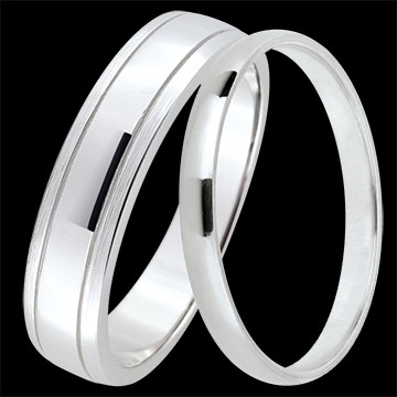 Une élégante paire d'alliances pour elle & lui. Un jonc fin poli de 2mm de largeur pour madame, un ruban en or blanc brossé est décorée d'une bande horizontale en or brillant pour monsieur.…