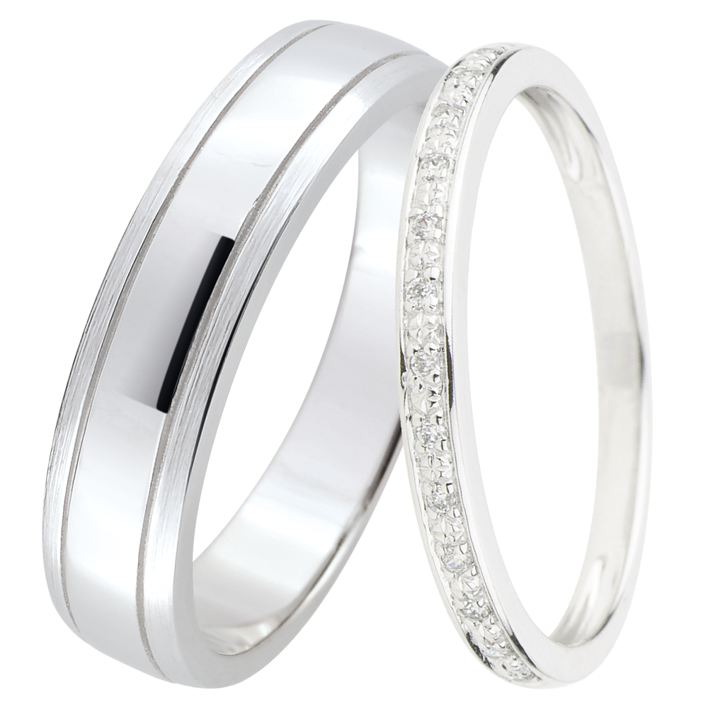 Une élégante paire d'alliances pour elle & lui. Une alliance or blanc sertie grain élégante et intemporelle pour madame, un ruban en or blanc brossé est décorée d'une bande horizontale en or brillant pour monsieur.