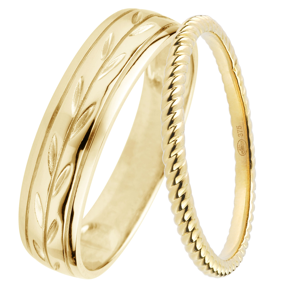 Une élégante paire d'alliances pour elle & lui.Un anneau en cordage d'or jaune pour madame, une large alliance d'or jaune gravée d'un feuillage éternel pour monsieur. Or jaune (9 carats = 375/1000): 0 g.Plus dimensions