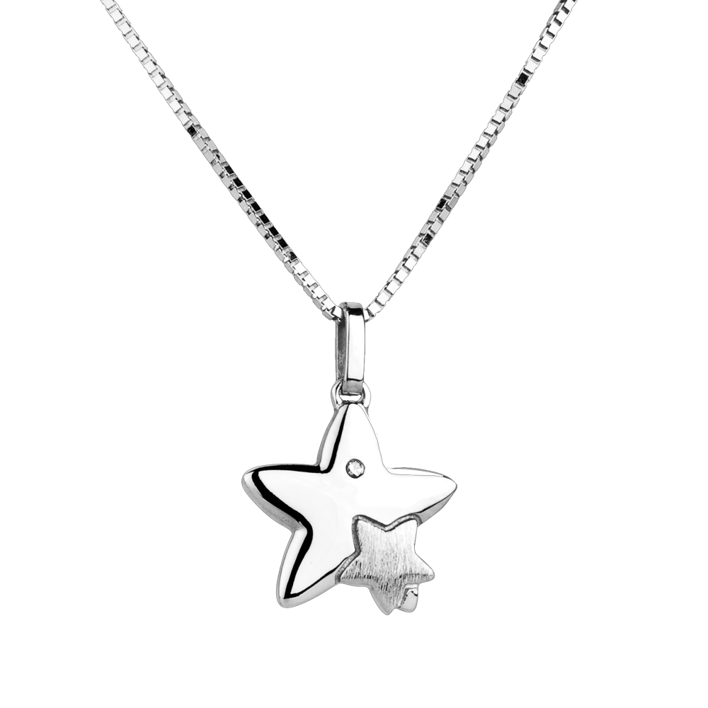 Ce pendentif en or blanc 18 carats met en scène une grande étoile portant sa petite, symbolisant un lien tendre et précieux.