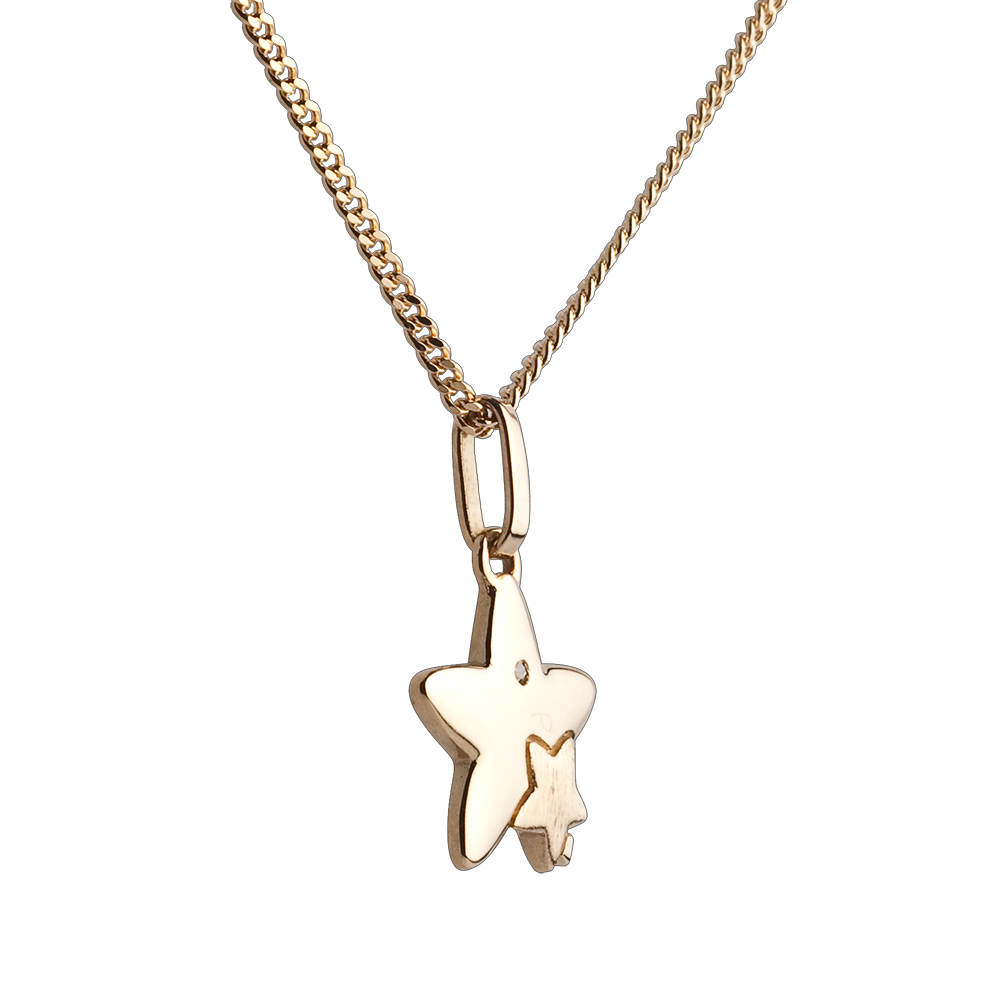 Une grande étoile porte sa petite dans un design délicat en or jaune 9 carats. Ce pendentif symbolise la tendresse et la complicité entre deux êtres.