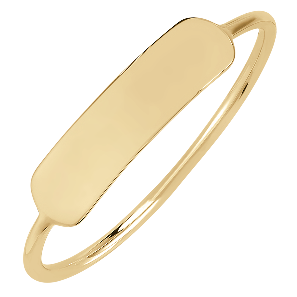 Cette bague fine en or jaune 9 carats offre un design épuré et élégant, parfait pour un style minimaliste. Son médaillon rectangle lisse est prêt à accueillir une gravure personnalisée, pour un bijou unique.