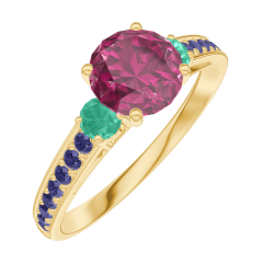 « L'ATELIER » Nº 165493Bague Or jaune 18 carats - Rubis Rond 0.7 carat - Pierres de côté Émeraude - Sertissage Saphir bleu 5 (7)
