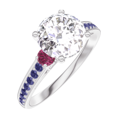 « L'ATELIER » Nº 187256Bague Or blanc 9 carats - Diamant synthétique Rond 1 carat - Pierres de côté Rubis - Sertissage Saphir bleu 4.7 (15)
