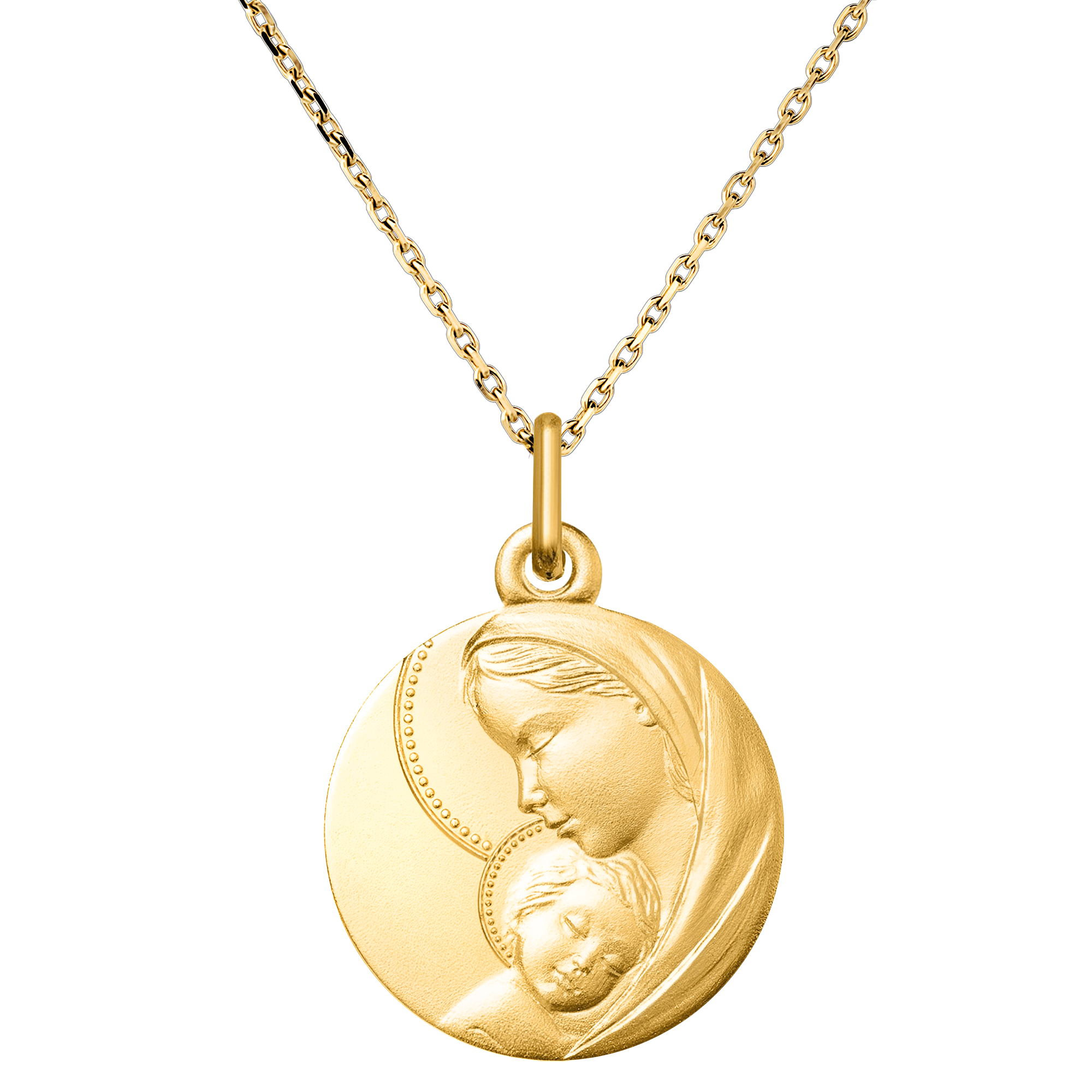 Cette médaille en or jaune capture un moment d’une tendresse : la Vierge Marie berçant tendrement l'Enfant Jésus. La douceur du visage de Marie et l’innocence de l’Enfant symbolisent l’amour maternel et divin. La fine bordure perlée ajoute une touche d’élégance à cette scène sacrée, faisant de cette médaille un bijou précieux, empreint de spiritualité et de protection. Parfait pour un baptême ou une communion, elle est une manière simple mais profonde de marquer des moments de foi. Matière : Or jaune 9 carats. Diamètre : 16 mm. Finition : Relief en or sablé. Gravure personnalisable au dos. Livrée dans un écrin raffiné, prête à être offerte pour une occasion spéciale. Livré sans chaîne. Or jaune (9 carats = 375/1000): 1.4 g. Plus dimensions
