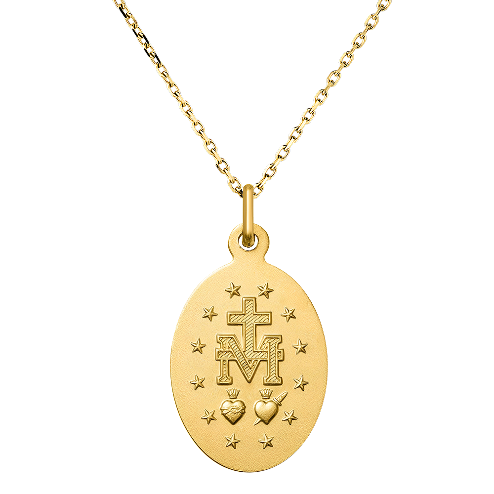 Réalisée en or jaune 18 carats, elle mesure 13x19 mm et présente un relief en or sablé sur les deux faces. Livrée dans un écrin soigné, elle constitue un cadeau spirituel chargé de sens.