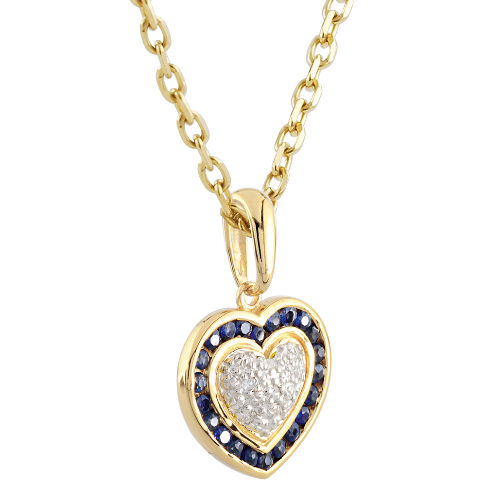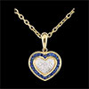 Un coeur en or blanc incrusté de 5 diamants est entouré par un pavage de saphirs. Eternel, élégant et romantique. Livré sans chaîne. 5 diamants : 0.02 carat - Or blanc et or jaune (9 carats = 375/1000): 1 g. Saphir bleu : 22 - Total: 0.34 carat Plus dimensions