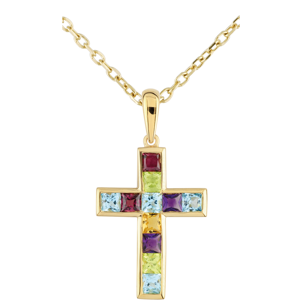 Une croix originale et féminine, parée de citrine, améthyste, peridot, topaze bleue, et rhodolite. Livré sans chaîne. Or jaune (9 carats = 375/1000): 0.9 g. Citrine jaune : 1 - Améthyste : 2 - Peridot : 2 - Rhodolite : 2 - Topaze bleue : 4 - Total: 1.17 caratPlus dimensions