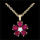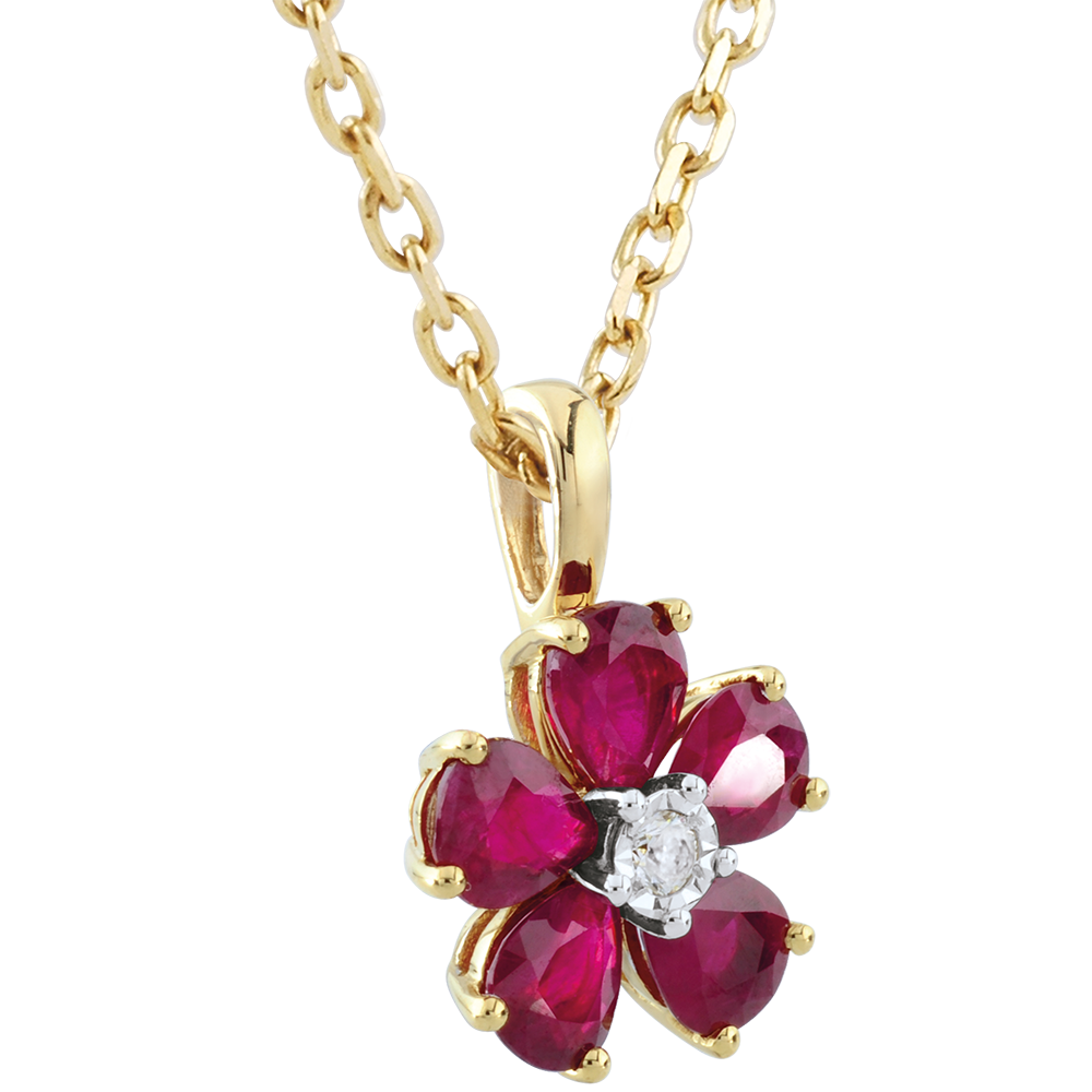 Des pétales de rubis et un coeur de diamant, des fleurs rares et précieuses. Dimension rubis poire: 5x4mm. Livré sans chaîne. 1 diamant : 0.04 carat - Or jaune (9 carats = 375/1000): 0.8 g. Rubis : 5 - Total: 1.94 carat Plus dimensions