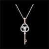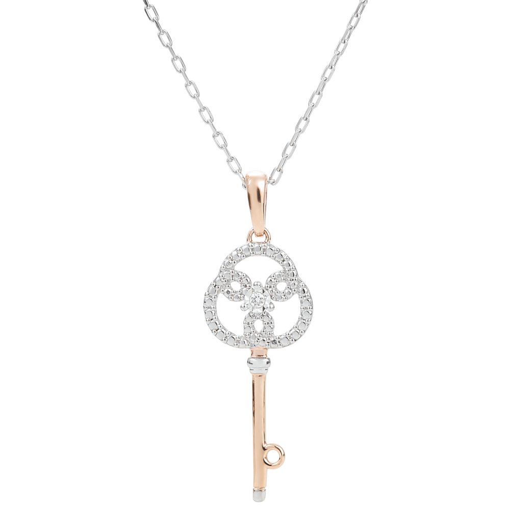 Pendentif clé en or rose et blanc dont les courbes voluptueuses serties de fleurs d'or veillent sur ce diamant unique pour l'éternité. Avec chaîne avec double position 42cm et 45cm en or 9 carats. 1 diamant : 0.01 carat - Or blanc et or rose (9 carats = 375/1000): 2.1 g. Plus dimensions