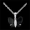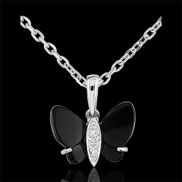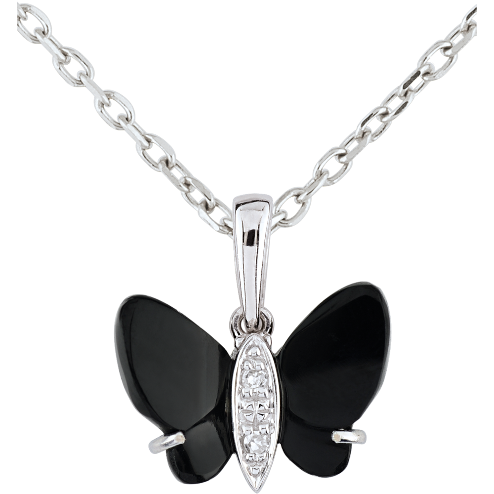 Des ailes d'onyx, un corps d'or et diamants pour ce papillon unique et envoûtant. Livré sans chaîne. 2 diamants : 0.01 carat - Or blanc (9 carats = 375/1000): 0.4 g. Onyx noir : 2 - Total: 0.96 carat Plus dimensions