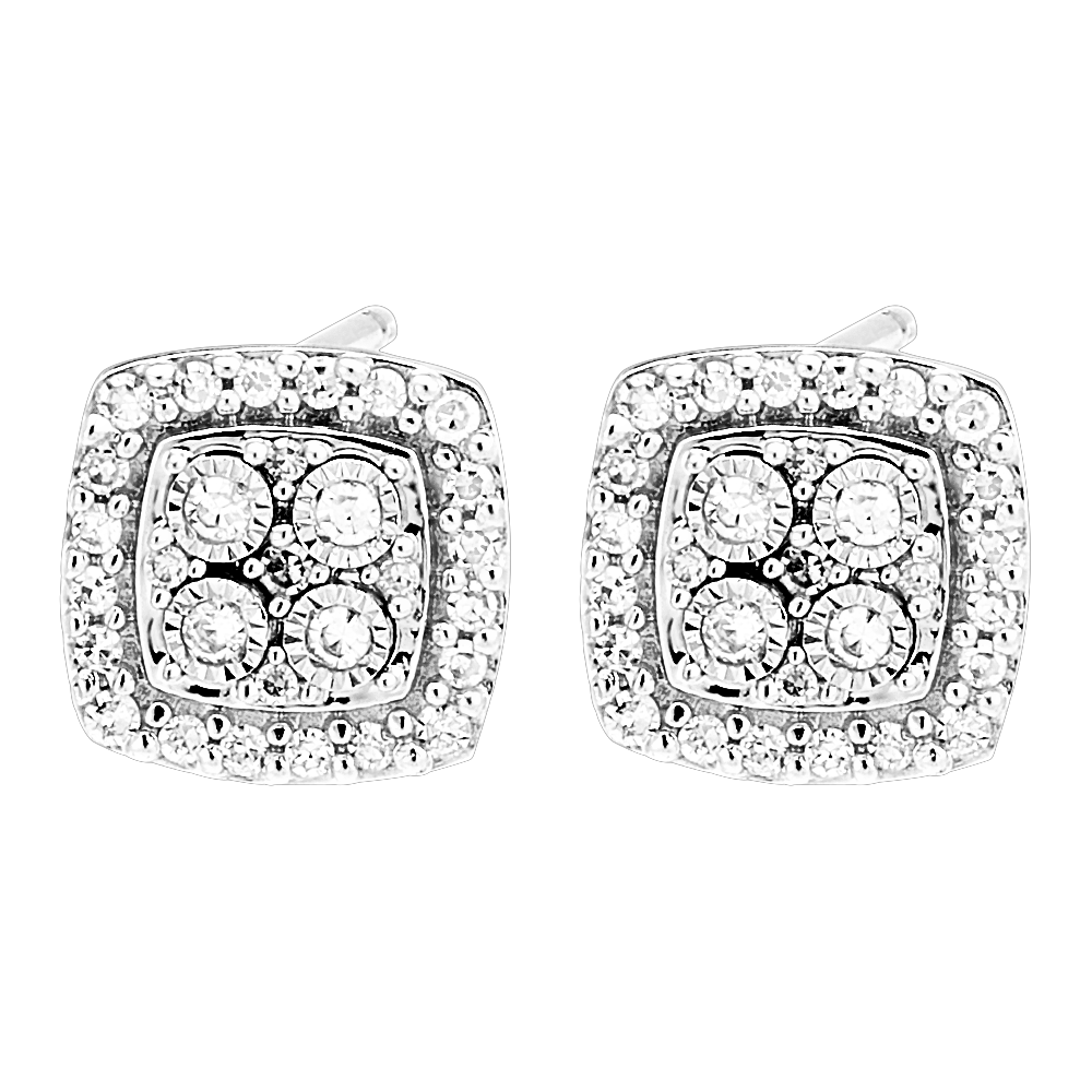 L'éclat de boucles d'oreilles au pavage diamant carré, couronné d'un halo de diamant. Un paire de puces en or blanc fin et subtil, empreintes d'une élégance intemporelle. 58 diamants : 0.13 carat - Or blanc (18 carats = 750/-): 1.3 g. Cluster de diamants naturels : 58 - Diamant - Total: 0.13 caratPlus dimensions