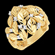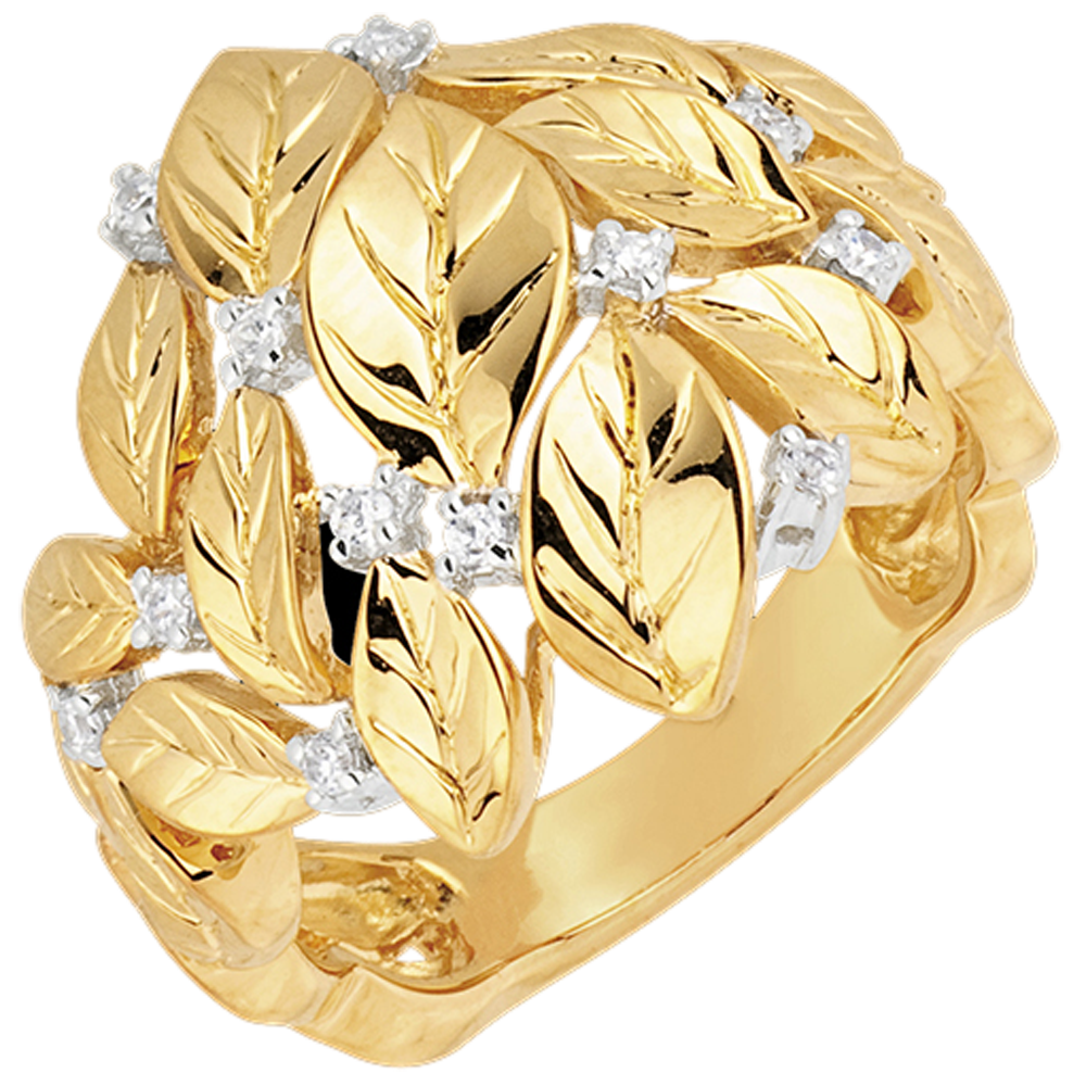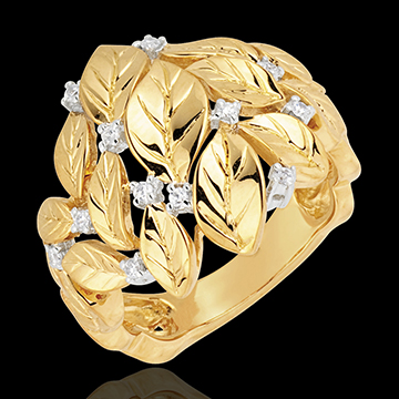 La délicate rosée capturée à l'aube de l'éden, sur son écrin de feuilles d'or, elle est l'éphémère joaillerie de la nature... Bague dessinée par Ruan Shanshan de l'école ESMOD. 11 diamants : 0.12 carat - Or jaune (18 carats = 750/-): 6.9 g. Plus dimensions