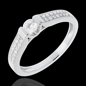 L'éclat absolu d'un diamant de centre sur une monture graphique et contemporaine soulignée d'un pavage adjacent. Diamant central: 0.18 carat. 29 diamants : 0.31 carat - Or blanc (18 carats = 750/-): 2.8 g.Plus dimensions