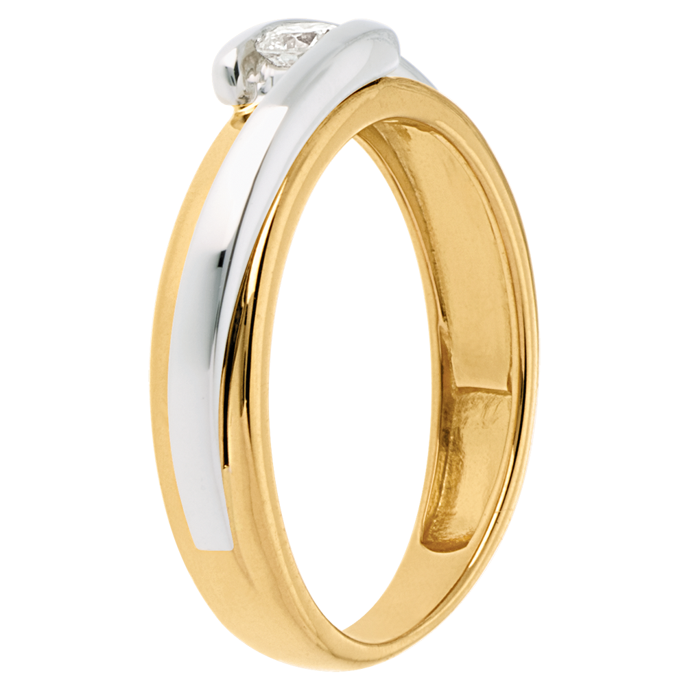Une monture sobre et classique associée à la force d'un alliage or jaune-or blanc, pour souligner avec délicatesse un diamant de centre.