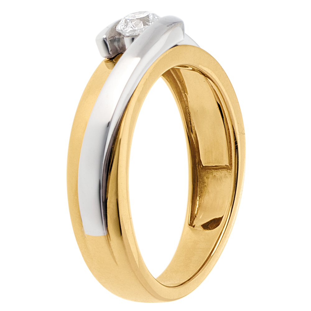 Une monture sobre et classique associée à la force d'un alliage or jaune-or blanc, pour souligner avec délicatesse un diamant de centre.