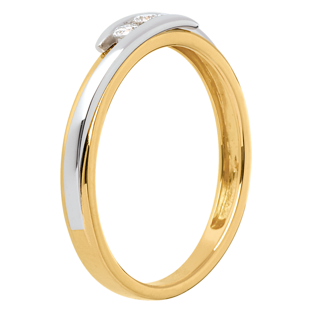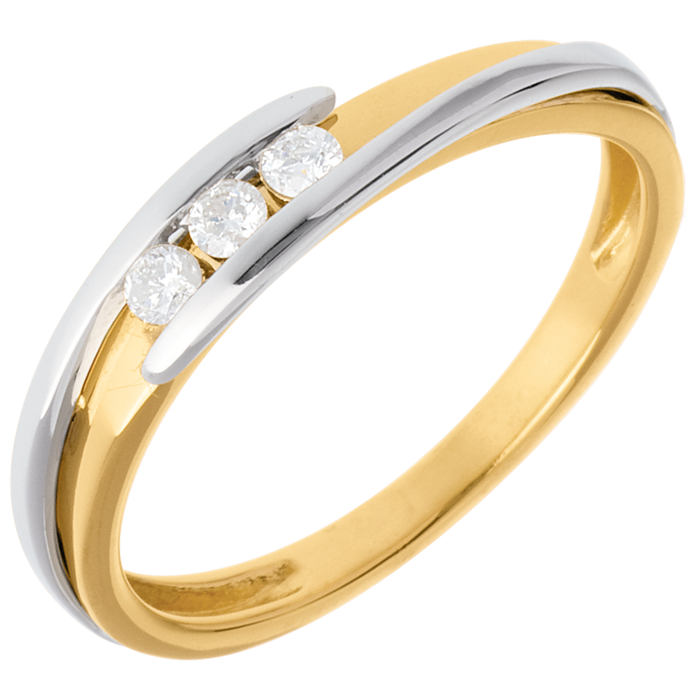 Une monture sobre et classique associée à la force d'un alliage or jaune-or blanc, pour souligner avec délicatesse une trilogie diamants.