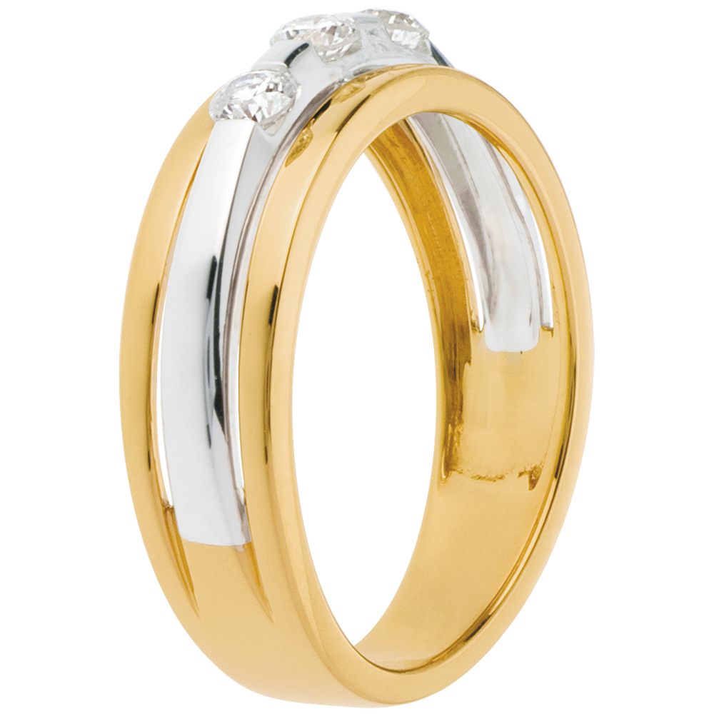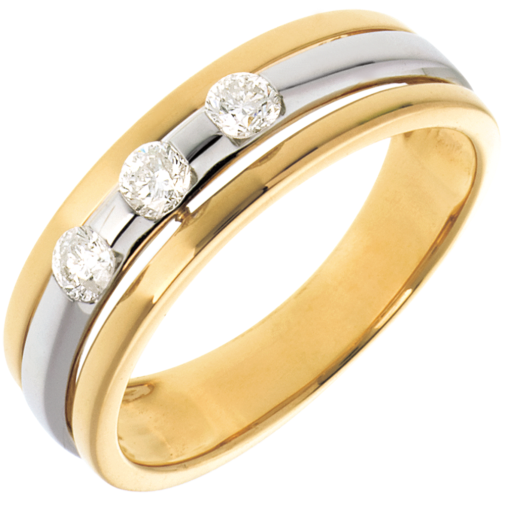La fusion de la demi lune et de l'anneau, couronnée d'une trilogie diamants, et soulignée par la force d'un alliage deux ors.
